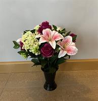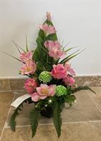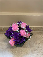 Petite coupe lestée de fleurs en tergal (roses et simpolias) de 26 cm de diamètre par 25 cm de haut