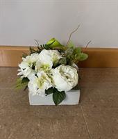 Composition de fleurs en tergal dans carré en ciment. 20 cm de haut x 24 cm de large