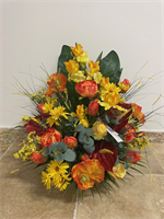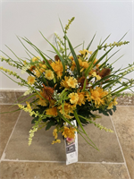 Composition de fleurs en tergal ton jaune orangé de 60 x 57 cm de haut