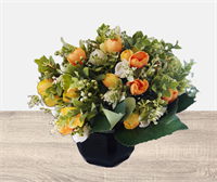 Jardinière avec roses rouges, jaunes et oranges en tergal.